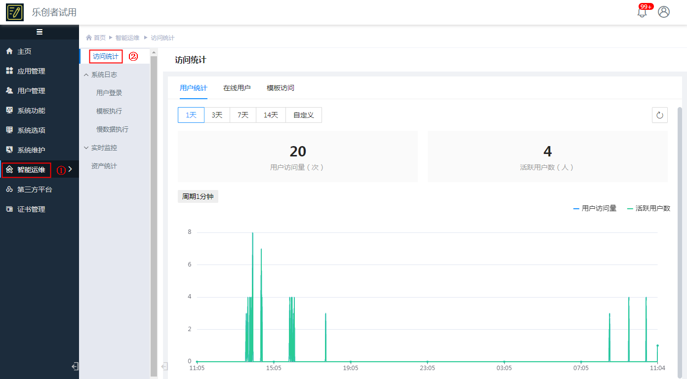 系统管理员登录系统,点击「智能运维>访问统计」,即可查看。如下图:
