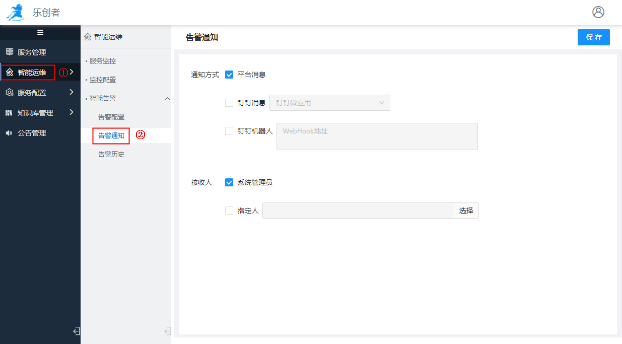 平台管理员登录系统,执行「智能运维>智能告警>告警通知」菜单,如下图: