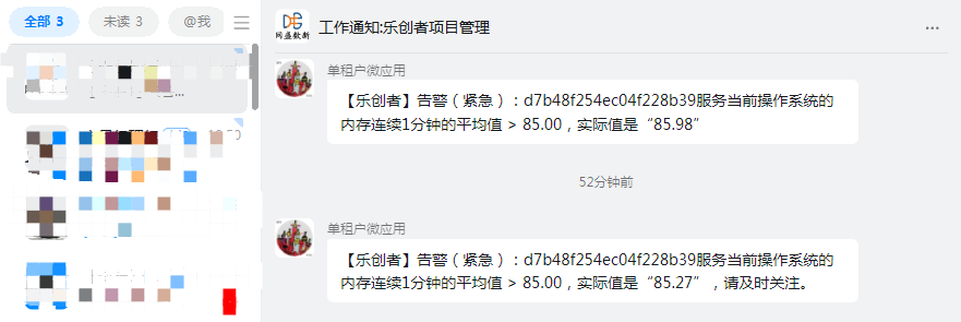 当操作系统的CPU使用率触发告警条件时,将给接收人发送机器人消息,效果如下图: