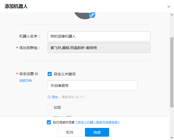 然后,勾选“我已阅读并同意《自定义机器人服务及免责条款》”,点击“完成”即可。