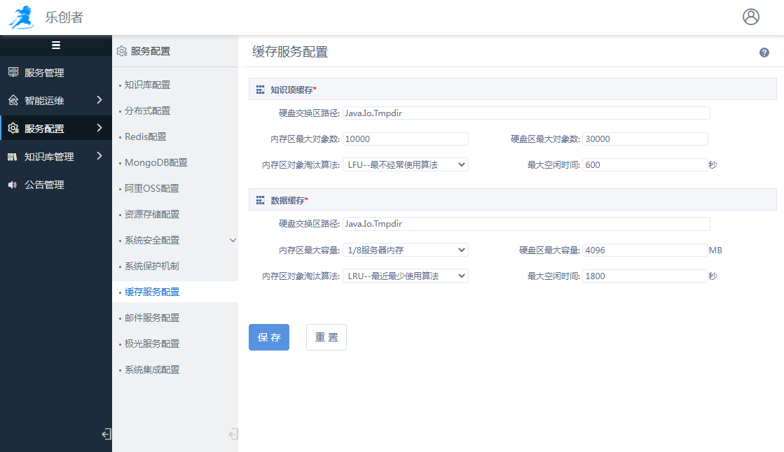 2) 内存区最大对象数/容量:可以设置知识项和数据在内存中存放的最大个数/容量,超出内存设置最大个数时根据内存区对象淘汰算法将淘汰的知识项和数据缓存存放在设置的硬盘交换区路径中;(范围:1000-100000/1024MB-102400MB)