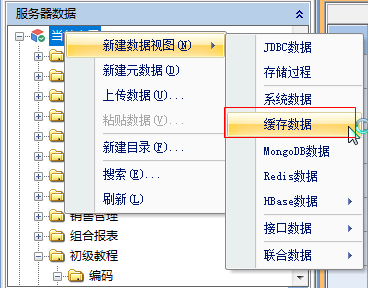 “数据”根目录或子目录右键执行“新建数据视图–》缓存数据”菜单,即可创建一个缓存数据数据视图,如下图: