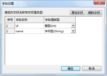 您可以按需增加、删除和修改字段的名称及类型,比如添加“id”和”name”两个字段,如下图: