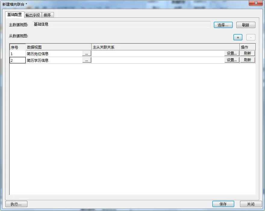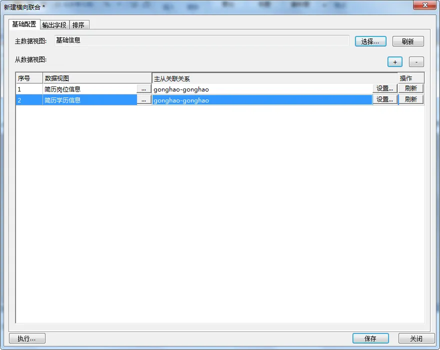 主数据视图选择前面准备好的主数据视图 “基础信息” ,同样地,将子数据视图 “岗位信息” 和 “学历信息” 逐一添加到从数据视图列表中,配置如下图: