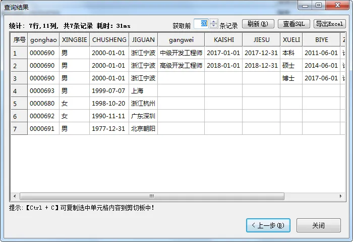 从查询结果可以看出,“横向联合”数据视图已经对数据进行了整理,同时包含了员工的基础信息、岗位信息和学历信息,不足的被补空行。
