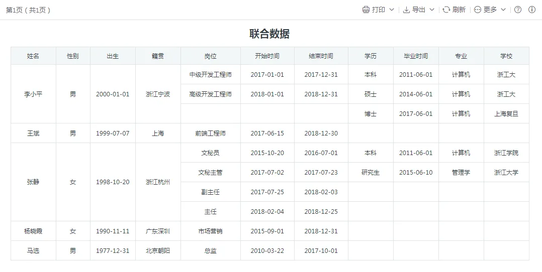 人员基础信息被合并了单元格,岗位信息和学历信息都是各自导航展示。至此,一张简单的横向联合的报表就制作完成了。