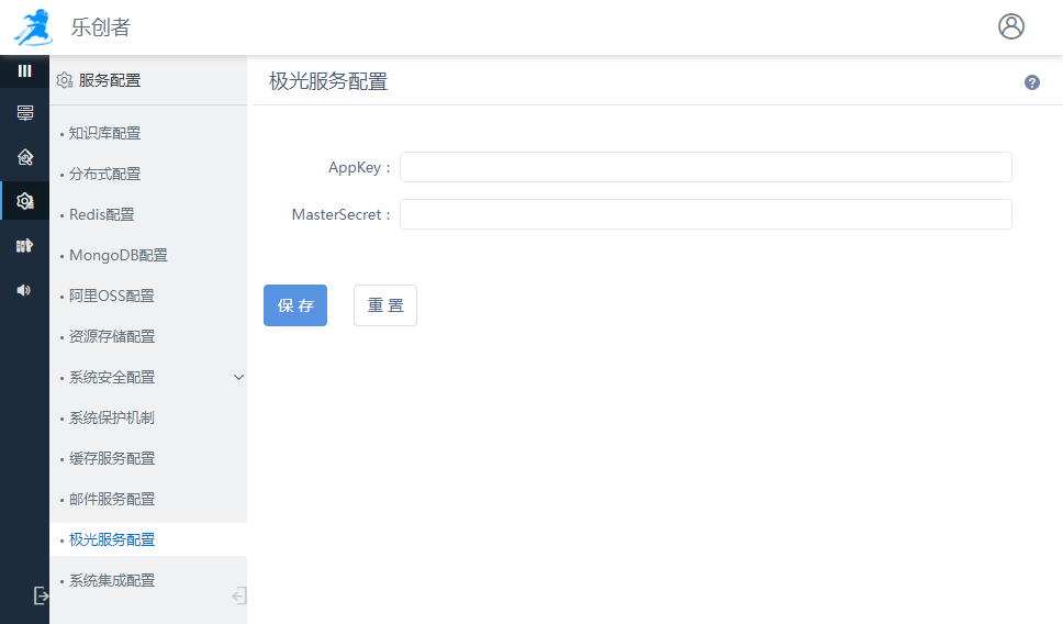 目录 搜索 展开 什么是乐创者乐创者概况特点和优势用户和乐创者应用场景产品组成模块和价格帮助资源联系我们安装和升级概述下载安装包运行安装包部署服务安装证书升级服务⊙?⊙常见问题设计器登录设计器主界面操作模板操作系统项操作属性栏操作数据操作连接操作视图操作集合操作资源-空操作应用⊙?⊙常见问题数据接入数据连接简介连接池和其他属性JDBC数据连接JDBC典型应用MySQL数据连接SQL Server数据连接Oracle数据连接ClickHouse数据连接[设计器]JDBC连接数据库其它JDBC应用ODBC数据连接PostgreSQL 数据连接Access 数据连接DB2数据连接Sybase数据连接其它JDBC数据连接【设计器】MongoDB连接国产化数据连接达梦数据连接PolarDB O数据连接AnalyticDB数据连接KINGBASE数据连接华为Gaussdb数据连接TIDB数据连接Redis连接Hbase连接Phoenix SQL数据连接Hbase API数据连接数据库连接驱动包数据视图简介JDBC数据JDBC数据简介图形模式SQL模式存储过程简介普通查询分页查询数据写入系统数据缓存数据MongoDB数据Redis数据Hbase数据简介Phoenix SQLHbase API接口数据http查询http写入自定义函数联合数据简介横向联合纵向联合数据模型简介数据模型管理关系型数据库查询SQL查询图形建模存储过程-空接口调用http查询http写入缓存数据NoSQL数据库查询数据接入常见问题SQL注入智能门户系统简介账户类型门户登录修改密码/忘记密码二次验证平台管理员服务管理服务配置知识库配置分布式配置Redis配置MongoDB配置OSS配置资源存储配置系统安全配置登录安全配置外部认证配置-空系统保护机制缓存服务配置邮件服务配置极光服务配置系统集成配置知识库管理升级备份公告管理智能运维简介访问统计平台日志服务监控监控配置智能告警告警配置告警通知告警历史租户管理系统管理员应用管理应用创建和配置应用设计简介应用主页设计中心岗位应用菜单共享菜单快捷面板任务面板lczApp菜单计划任务-空简介任务管理计划管理运行监控知识项权限管理简介模板权限数智大屏权限流程权限指标权限数据权限数据连接权限设计器许可名单应用资源模板水印管理图片应用导入和导出用户管理部门角色用户用户管理子账号系统功能简介主页菜单栏快捷面板任务面板lczApp菜单系统选项用户体系 用户来源用户认证模板选项工作任务选项采集任务选项数智大屏选项首选项登录配置访问控制系统角色授权系统告警开发者选项系统维护图片资源用户变量主题配置系统页面样式门户样式配置信息维护FTP站点配置DFS站点配置乐创者消息RocketMQ消息智能监控简介访问统计实时监控资产统计审计日志简介用户登录模板执行慢数据执行消息日志第三方平台微信公众号开放平台企业微信基础配置微应用配置钉钉基础配置微应用配置浙政钉支付宝开放平台短信OSS百度地图高德地图国家天地图天地图管理数据库管理(多租户)上架应用管理(多租户)-空系统集成第三方系统注册门户配置公共操作门户链接上标数字应用管理员用户管理员审计管理员普通用户消息中心我的收藏切换账号移动端应用lczApp第三方微应用微信小程序Webkit 浏览器安全和运维平台安全权限控制智能运维审计日志数据安全服务资源1. 系统变量2. 自定义变量3. 系统宏4. 全局参数门户样式知识库表概述平台相关表租户相关表组织用户相关表应用模板相关表菜单及权限表用户数据相关表乐创者标准用户体系概述标准表结构说明概述SYS_TENANTSSYS_DIVISIONSSYS_ORGSSYS_USERSSYS_ROLESSYS_USERS_ROLES建表语句MySQL达梦多租户租用关系中的镜像功能 暂无相关搜索结果! 极光服务配置 1 概述1.1 版本1.2 功能简介2 配置1 概述1.1 版本 服务器版本 v6.9.0及之后版本 1.2 功能简介由于lczApp外消息是依赖于极光服务的,所以需要在lczApp外就能接收到公告和待办消息通知,就要进行极光服务配置。2 配置首先需要去极光官网去注册获取用户名或密码,然后将其填写到极光服务配置中,如下图:AppKey:填写申请的极光账号的用户名。MasterSecret:填写申请的极光账号的密码。作者:fancy 创建时间:2023-06-21 15:32最后编辑:fancy 更新时间:2025-09-15 16:13 扫码关注网盛数新公众号,获取更多帮助资料 上一篇:无 下一篇:无 提交评论