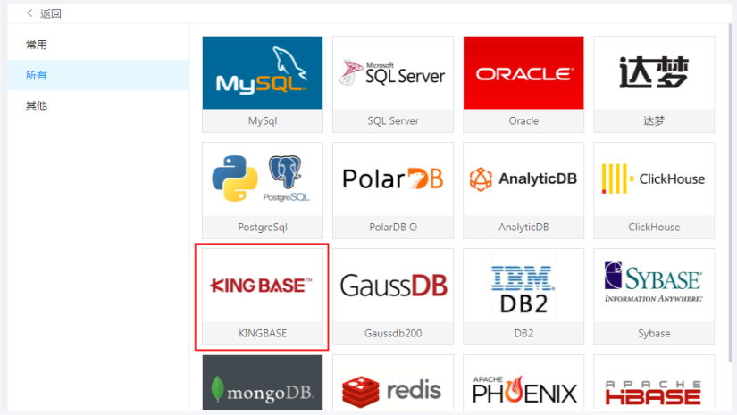 以管理员身份登录门户,进入“应用管理>设计>数据连接管理”界面,点击“+”,在“所有”选项下选择 “KINGBASE”,如下图所示:2.2.3 选择配置方式