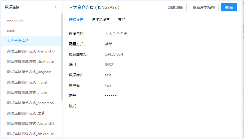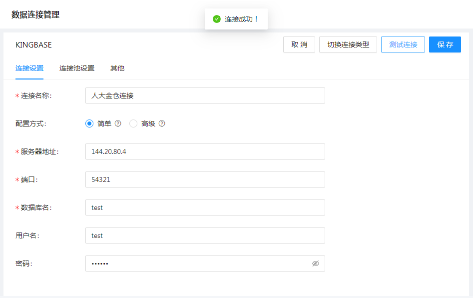 “连接池设置”和“其它”的配置,请参考:数据连接管理2.2.4 测试连接