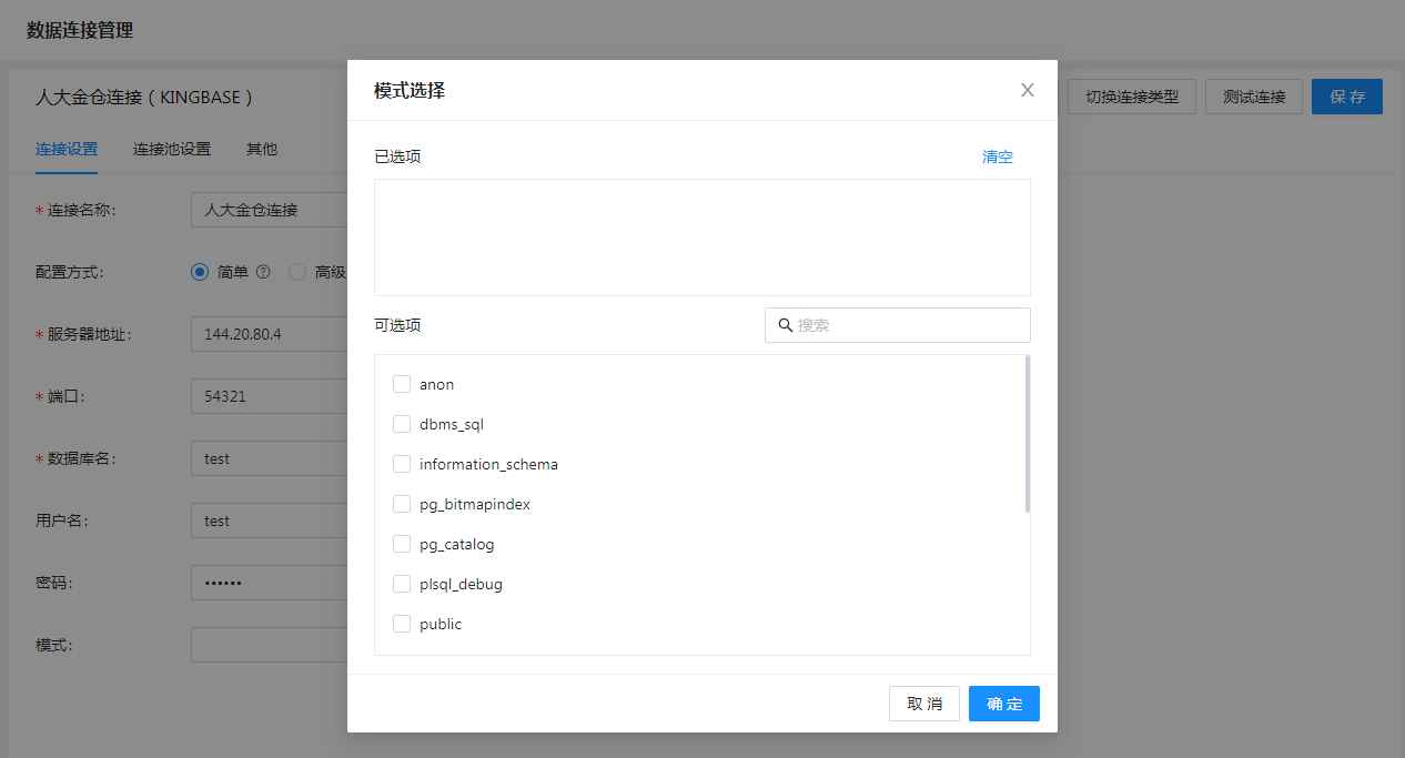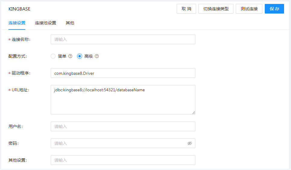 点击“KINGBASE”进入连接配置页面,支持两种配置方式,按需选择: