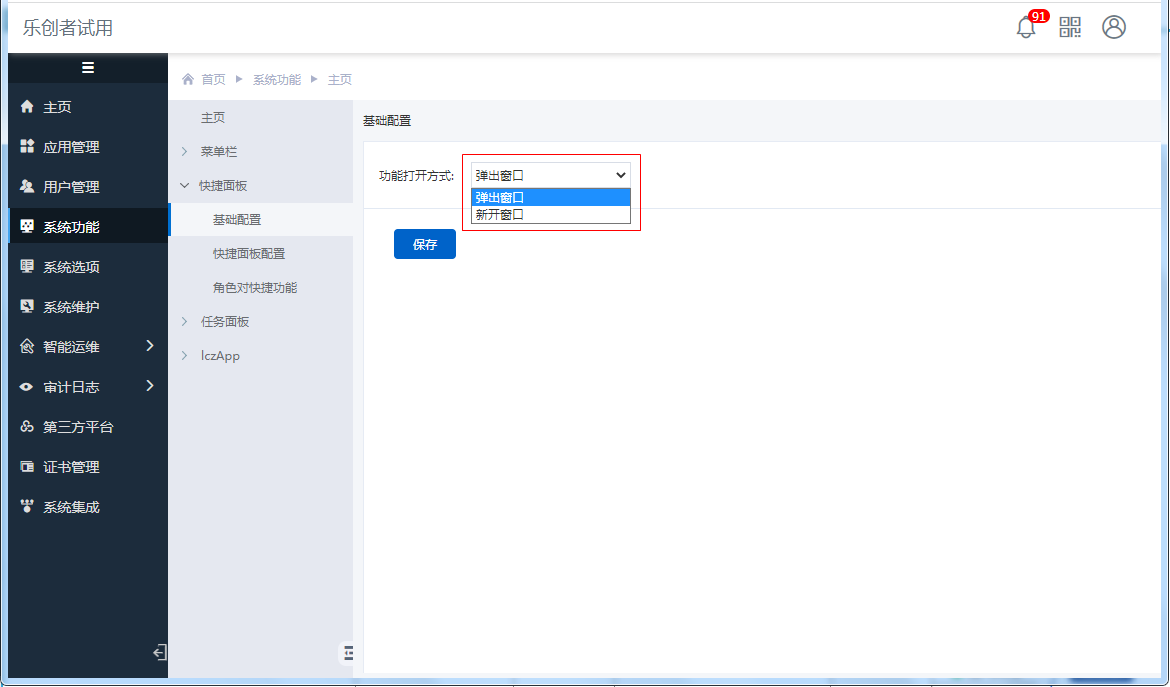 此处的快捷面板配置主要用于配置外层门户的快捷功能、分配快捷功能访问权限,功能包括:基础配置、快捷面板配置、角色对快捷功能。