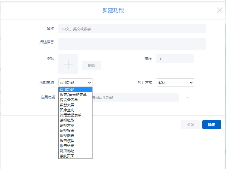 与应用内快捷面板配置功能类似,主要不同的是功能配置时支持的功能来源不同,此处支持引用应用功能,如下图: