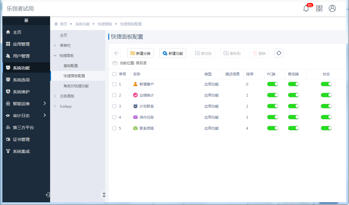 v6.9.2 | 快捷面板配置列表增加“PC端”和“移动端”两列配置,对不同客户端访问进行限制 |