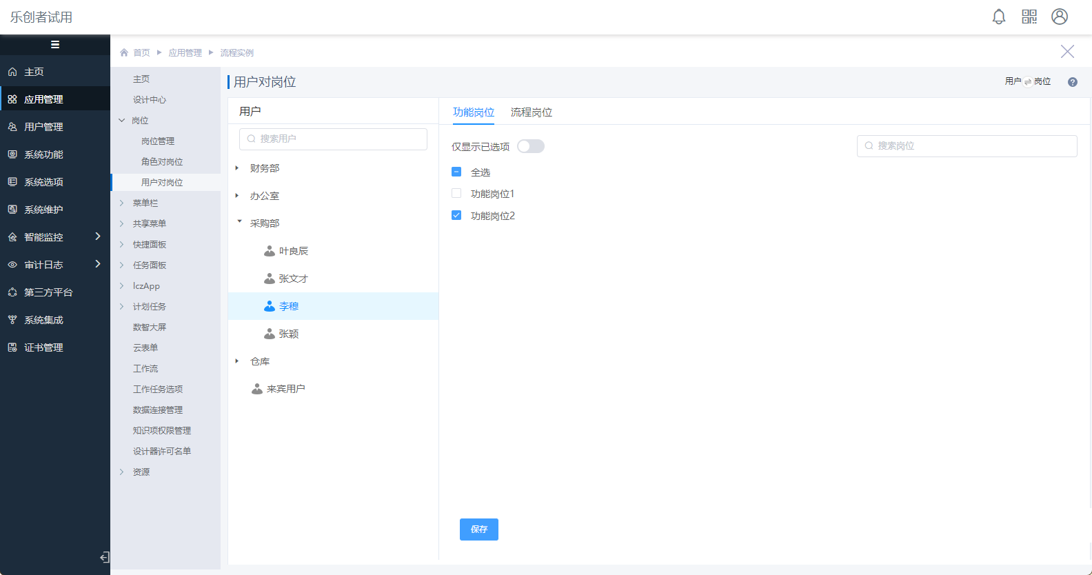 例如:为用户“李穆”设置为“功能岗位2”,如下图所示。