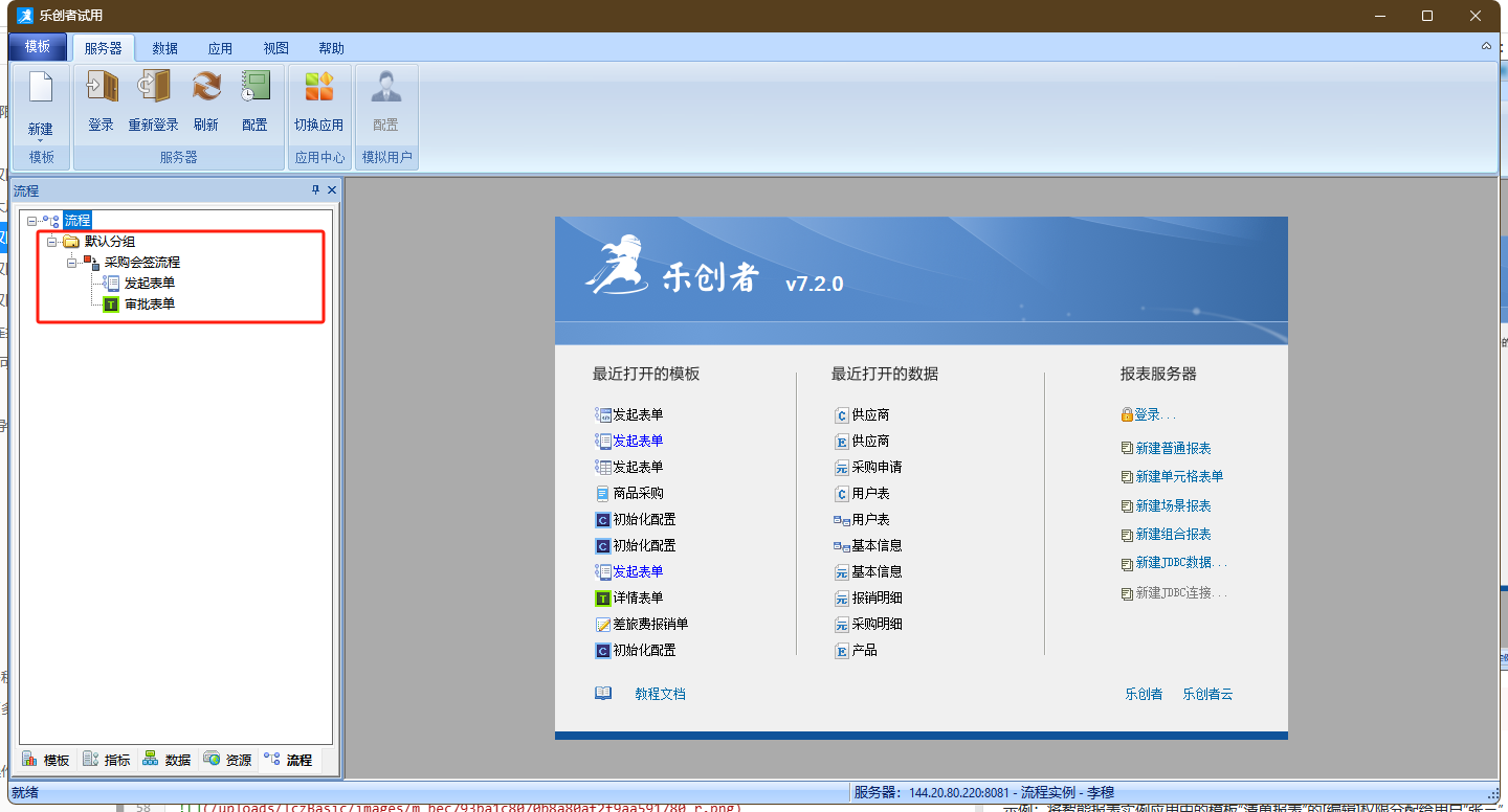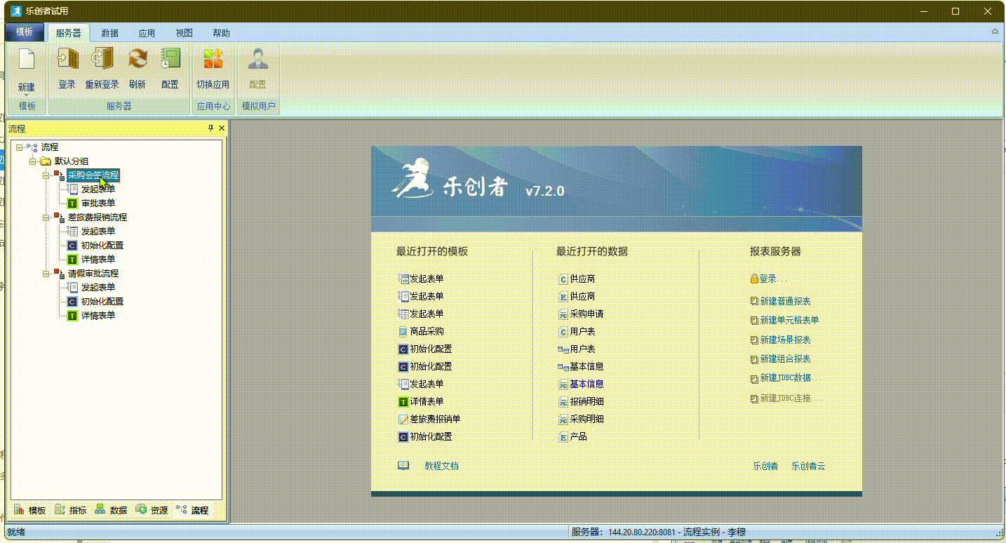 同样使用“李穆”的身份登录设计器,此时“李穆”拥有三个流程的可见权限,因此可以看到三个流程,但其仅有“采购会签流程”的编辑权限,因此仅能对工作流“采购会签流程”进行设计和编辑,如下图: