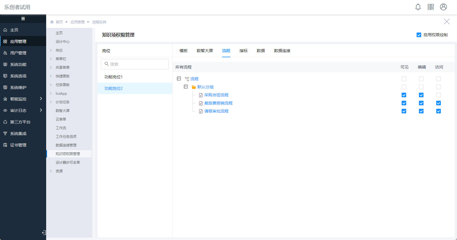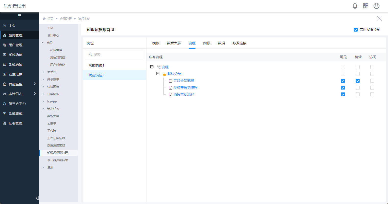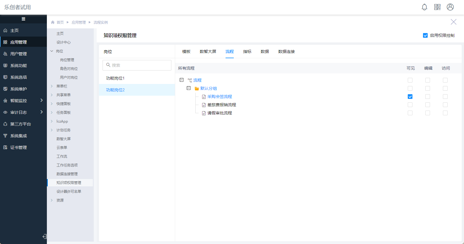 点击“知识项权限管理”菜单,勾选“启用权限控制”,选择“功能岗位2”岗位,在“流程”权限中勾选对应工作流[可见]权限,如下图: