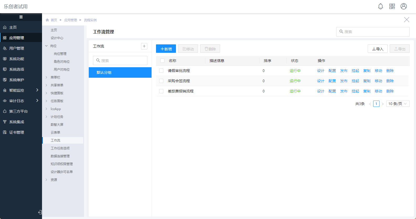 示例:应用【流程实例】中共有三个工作流,需要控制具备设计器许可权限的用户”李穆”虽可以看到这三个流程,却只能编辑“采购会签流程”,其余两个流程不可编辑。