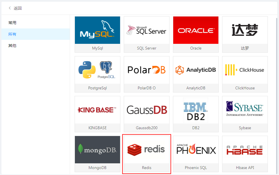 管理员登录门户,进入“应用管理>设计>数据连接管理”界面,点击“+”,在“所有”选项下选择 “Redis”,如下图所示: