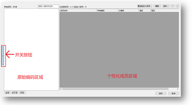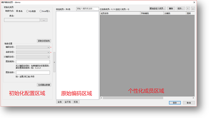 1)界面分左、中、右分别是“初始化配置区域”、“原始数据区域”和“个性化成员区域”;