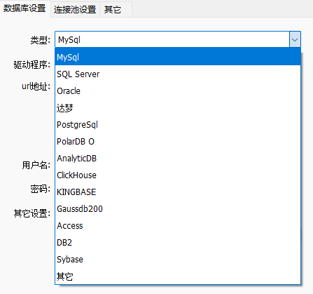 高级方式包含了普通方式支持的数据库类型,截图如下: