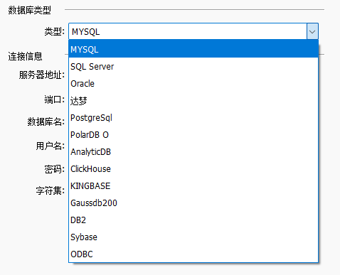 目前支持的数据库类型比较丰富,包含了国产数据库,如达梦、人大金仓(KINGBASE)、华为(Gaussdb200)、阿里云(AnalyticDB)等,截图如下:- ODBC:如果选择的数据库类型是ODBC,那么这个文本框就可以填写内容,填写的是ODBC的数据源的名称;