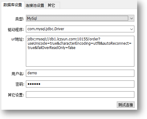 jdbc:MySQL://db1.lczyun.com:10155/order?