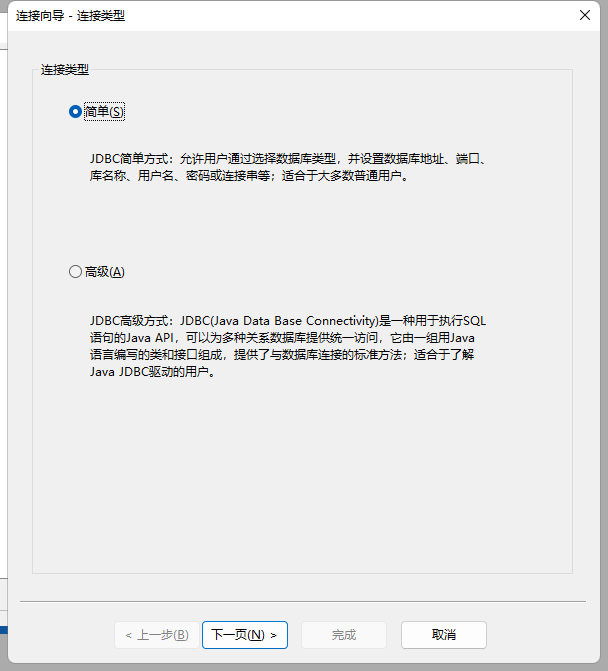 JDBC的创建,系统提供了一个向导视窗,有[简单]和[高级]两种方式,截图如下: