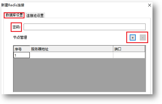节点管理:默认一条空记录,至少要配置一个节点(服务器地址和端口都必填),通过“+”可在下方添加一条。“-”按钮在选中非第一条记录时可用。