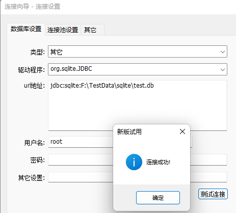 以sqlite数据库为例,找到sqlite的JDBC驱动,配置好服务后连接成功,截图如下: