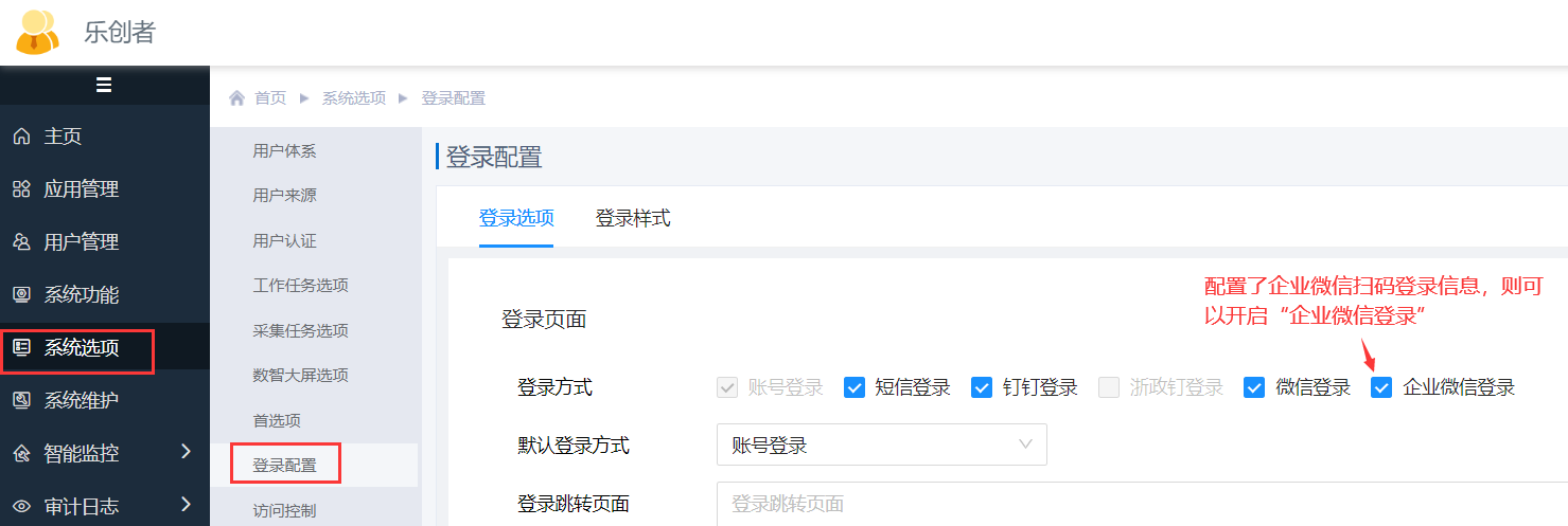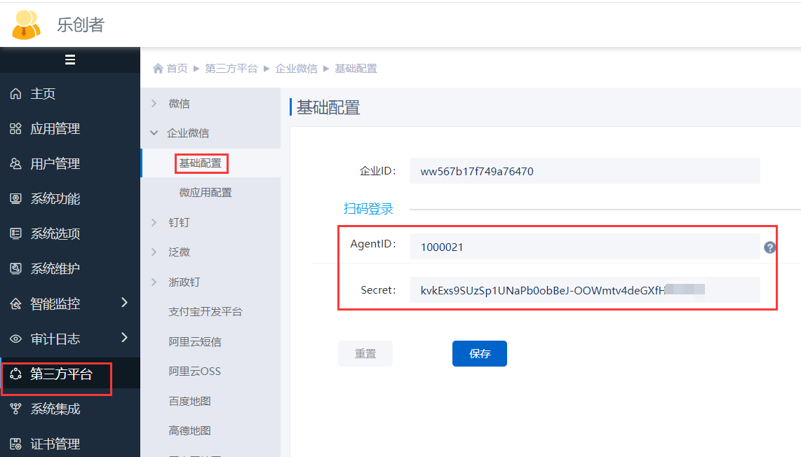 管理员登录乐创者门户,在“第三方平台->企业微信->基础配置”的扫码登录,填写上述 2.1创建应用 章节所获取的AgentID、Secret。