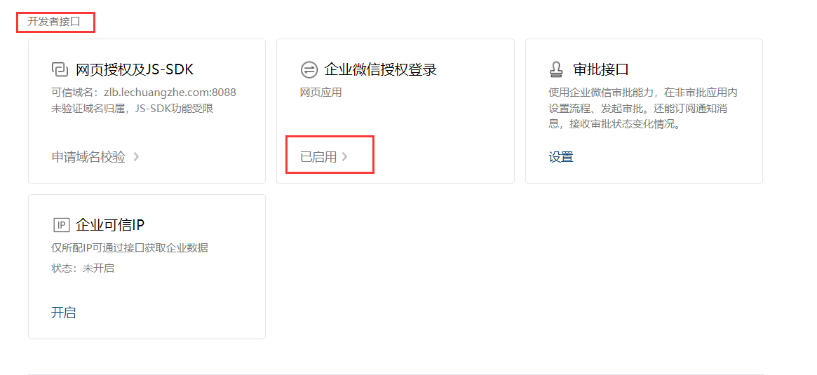 进入应用的详情,在 “开发者接口”区域,点击“企业微信授权登录” 配置