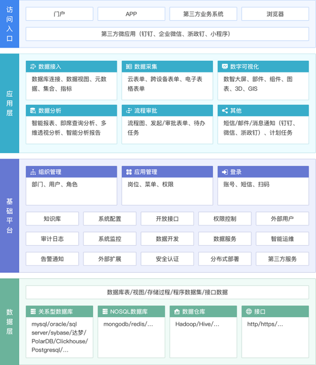 乐创者按照业务划分,可细分为数据接入、数据采集、数据集成、数据服务、数据分析、数据可视化、流程审批等子产品,并自带门户、App等访问入口,既可以独立构建业务系统,也可以将报表、大屏、表单等整合到第三方系统中。