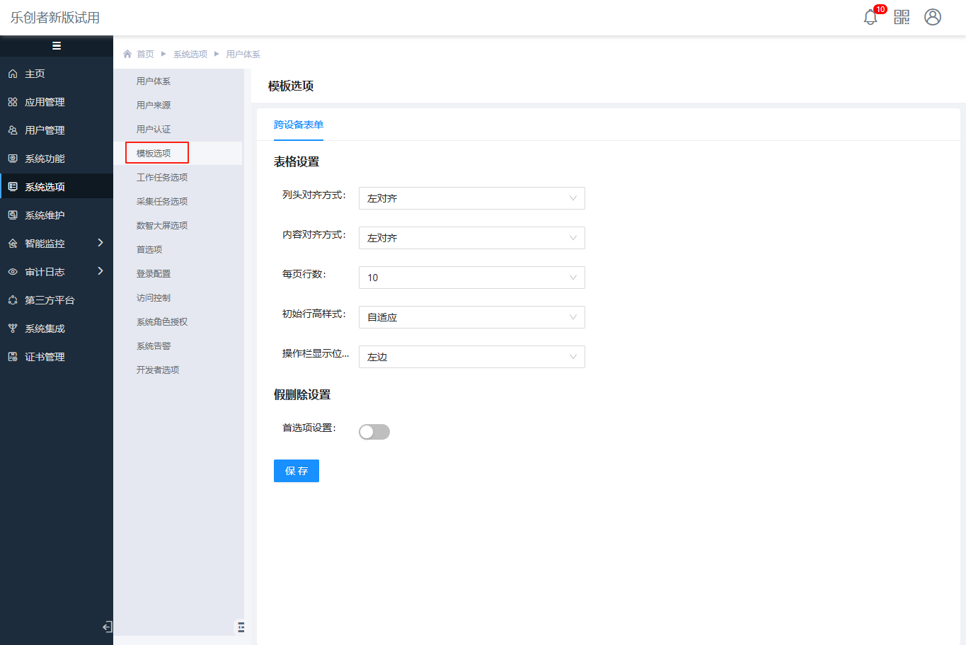 在模板选项中可以为跨设备表单(元数据和模板)等模板设置部分配置的首选项,以便于批量为新增模板设置不同于预设的选项值,避免需要手动调整。