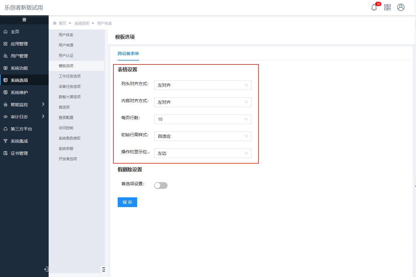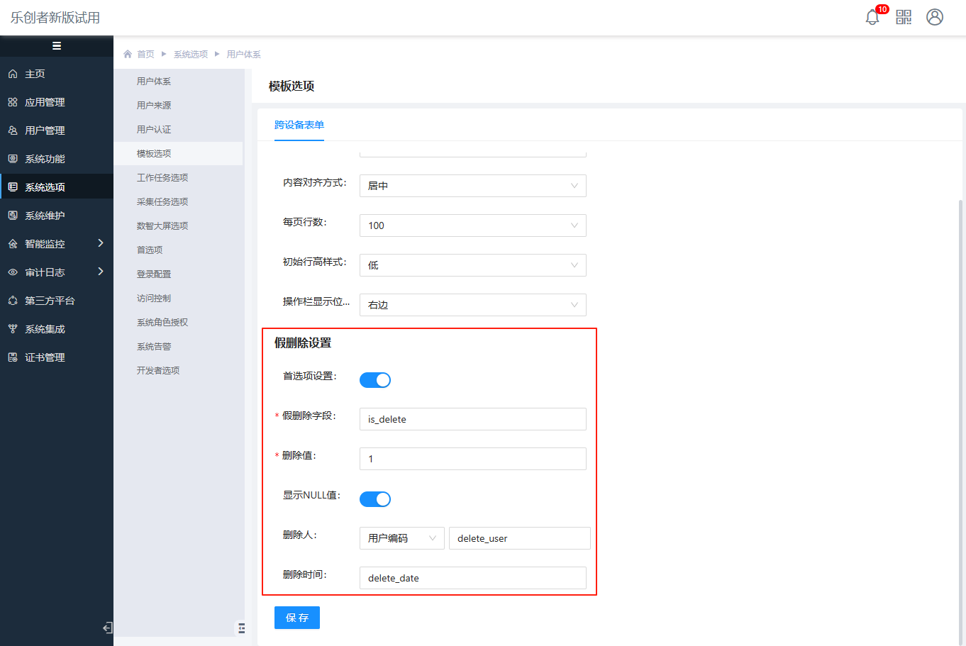 开启此处配置,可以对元数据假删除设置进行统一规则的配置,例如业务表中对假删字段名称、假删值、假删用户字段名称和假删时间字段名称制定了统一的规范,可以在这里集中配置,节省一些元数据创建时的配置操作。