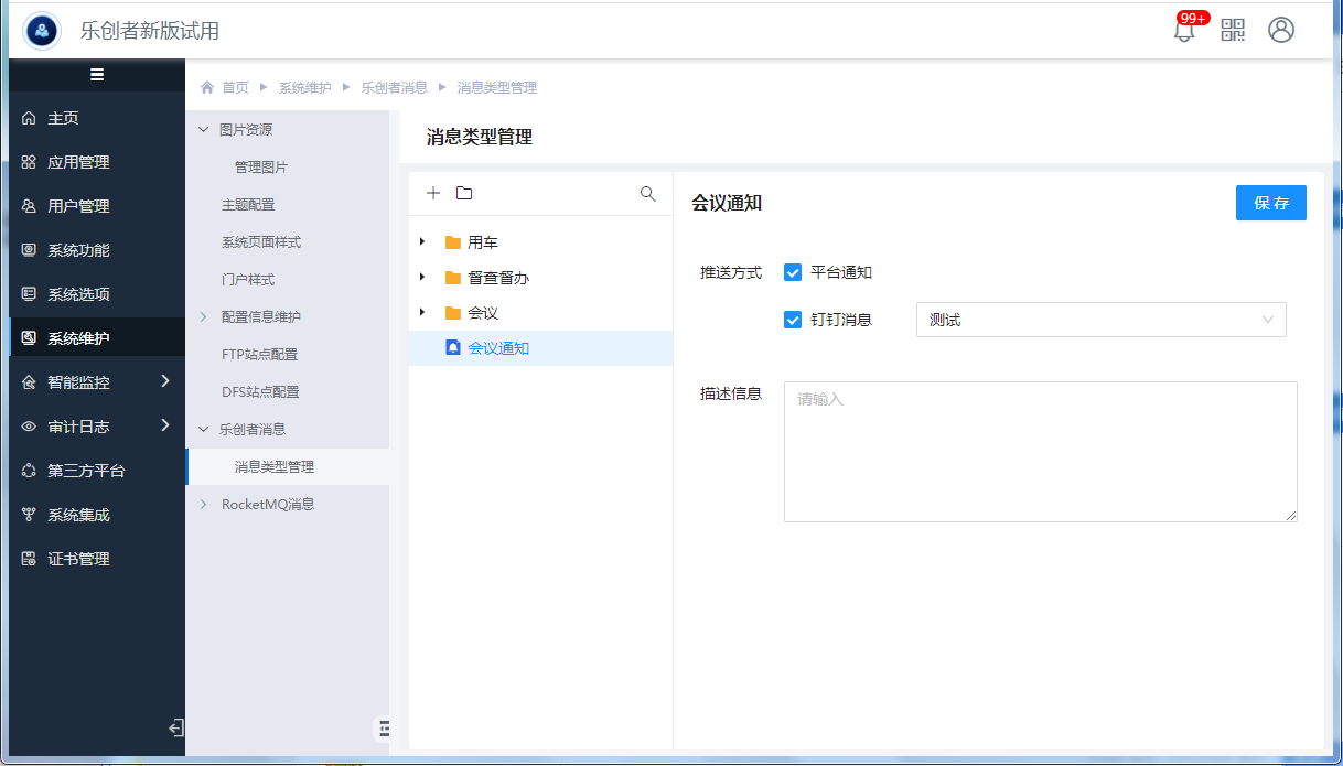 乐创者消息主要用于统一消息中心的消息类型管理,可按业务自定义消息类型,配置支持的消息推送方式。