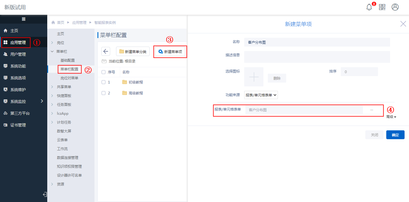 普通用户要访问模板,则需要将模板“客户分布图”配置为菜单并为其分配权限,菜单配置如下图: