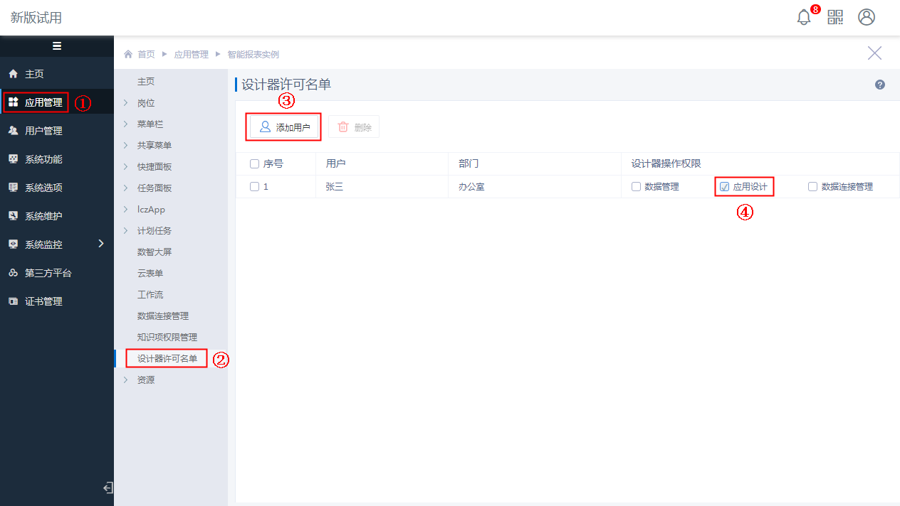 一般模板的可见权限是应用于设计者,想要查看刚才设置的可见权限是否生效,我们需要允许“张三”能够登录设计器,并且分配“应用设计”权限,即需要将“张三”添加到设计器许可名单中,设置如下图: