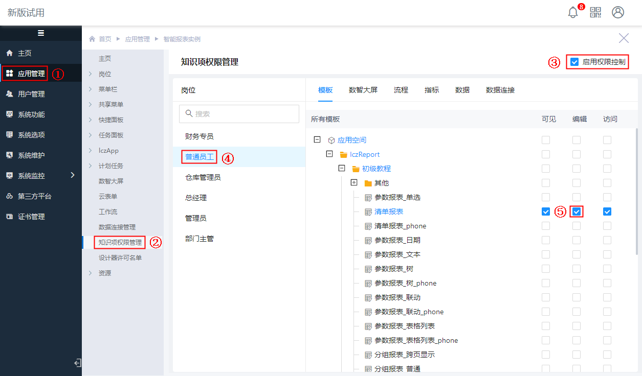在上面“模板可见权限”配置的基础上,只需要在“知识项权限管理”中为“清单报表”配置[编辑]权限即可,如下图: