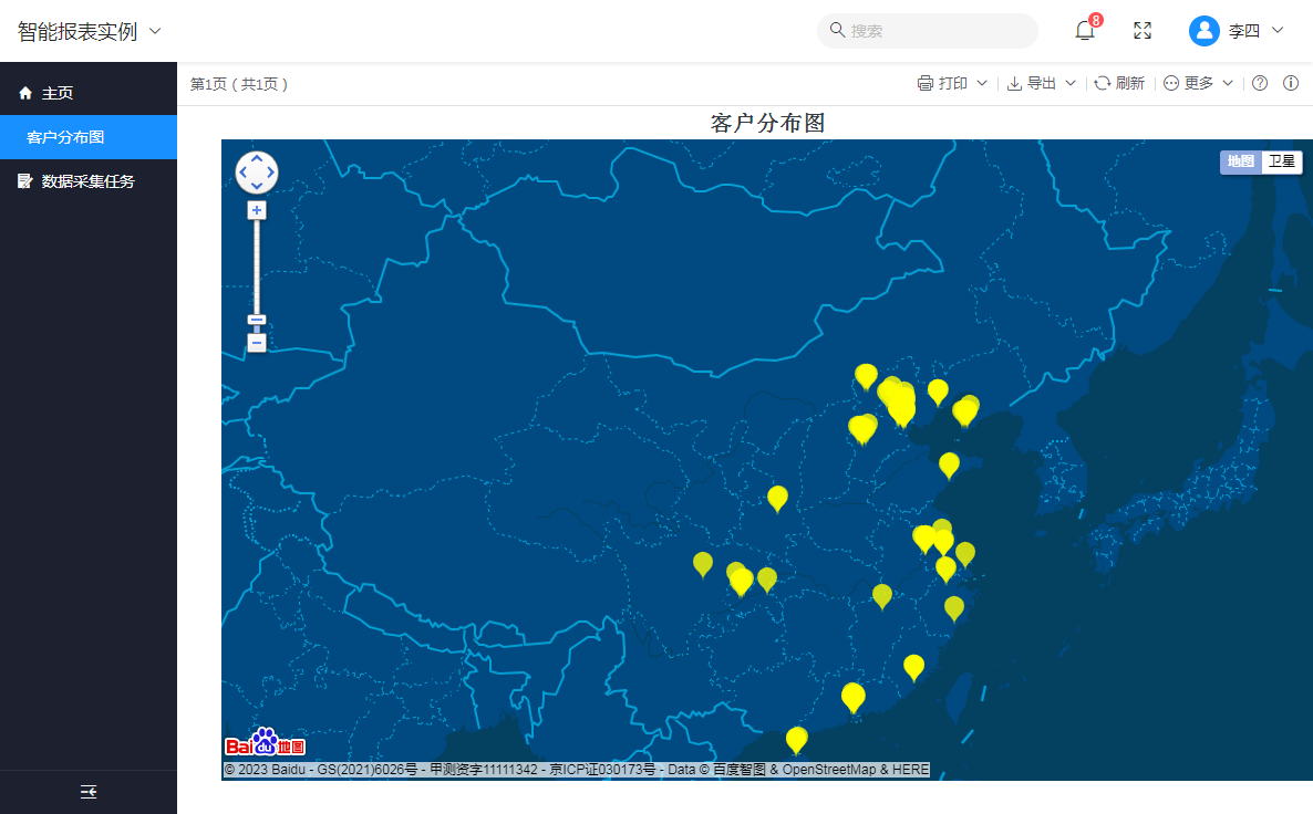 使用“李四”的身份登录门户,可以看到该应用下有一个菜单“客户分布图”,点击该菜单可正常访问该菜单对应的模板,如下图: