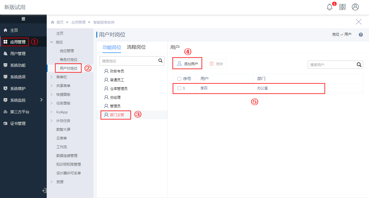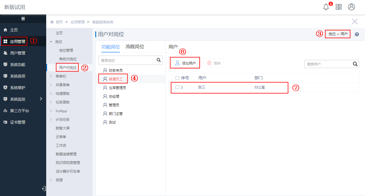 选择功能岗位中的“普通用户”,通过“添加用户”将“张三”添加进去即可。