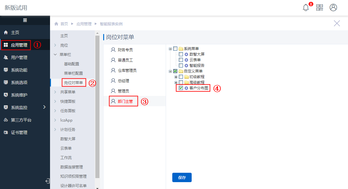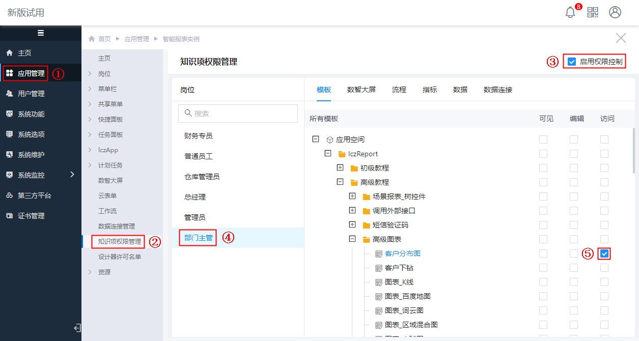 进入“知识项权限管理”,为“部分主管”岗位配置“客户分布图”模板的[访问]权限,如下图: