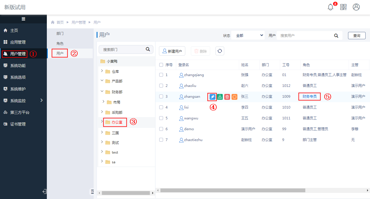 首先,进入[用户管理->用户],为用户“张三”设置一个角色,比如“财务专员”,如下图: