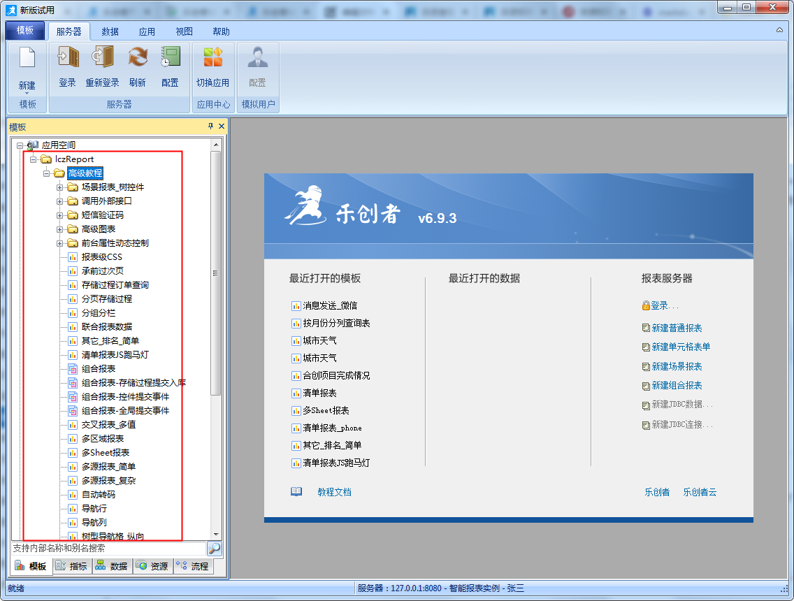 使用“张三”的账号和密码登录设计器,选择“智能报表实例”应用,进入“模板”tab,我们可以看到仅能看到有可见权限的模板,无可见权限的模板则看不到,如下图: