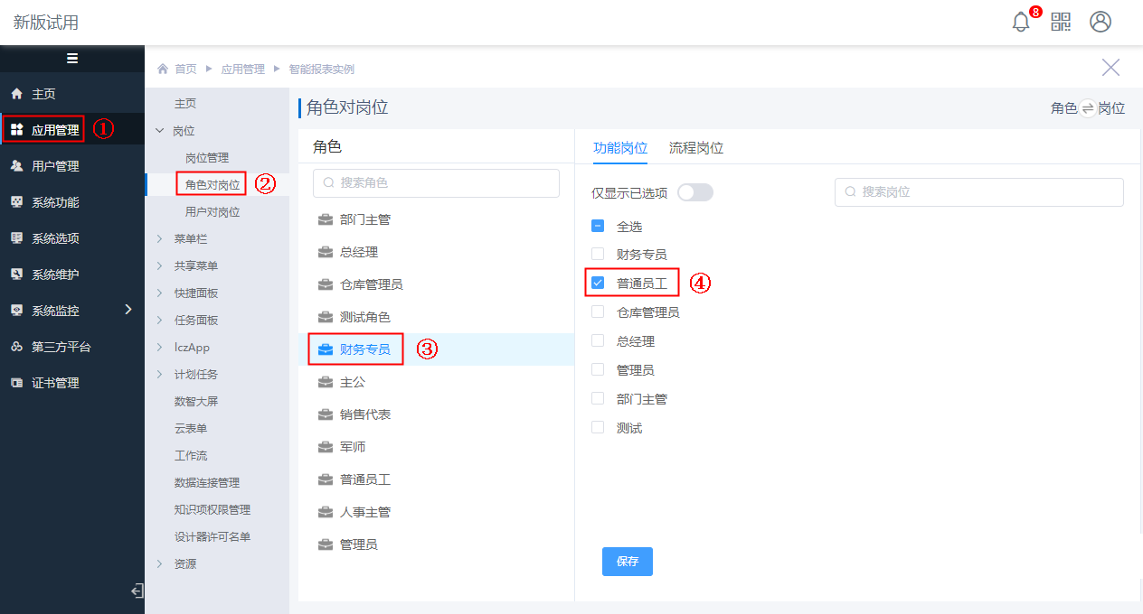 然后,进入应用设计界面,点击“岗位->角色对岗位”进入设置界面,为“财务专员”角色分配功能岗位“普通员工”,如下图: