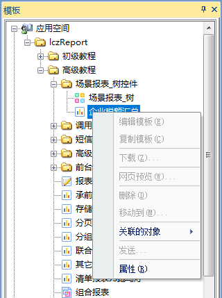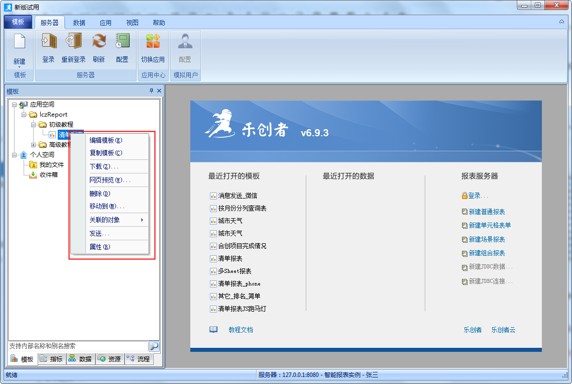 同样使用“张三”的身份登录设计器,此时“张三”则拥有了“清单报表”的编辑权限,即可以对该模板进行修改、复制、下载、移动、删除、预览等操作。如下图: