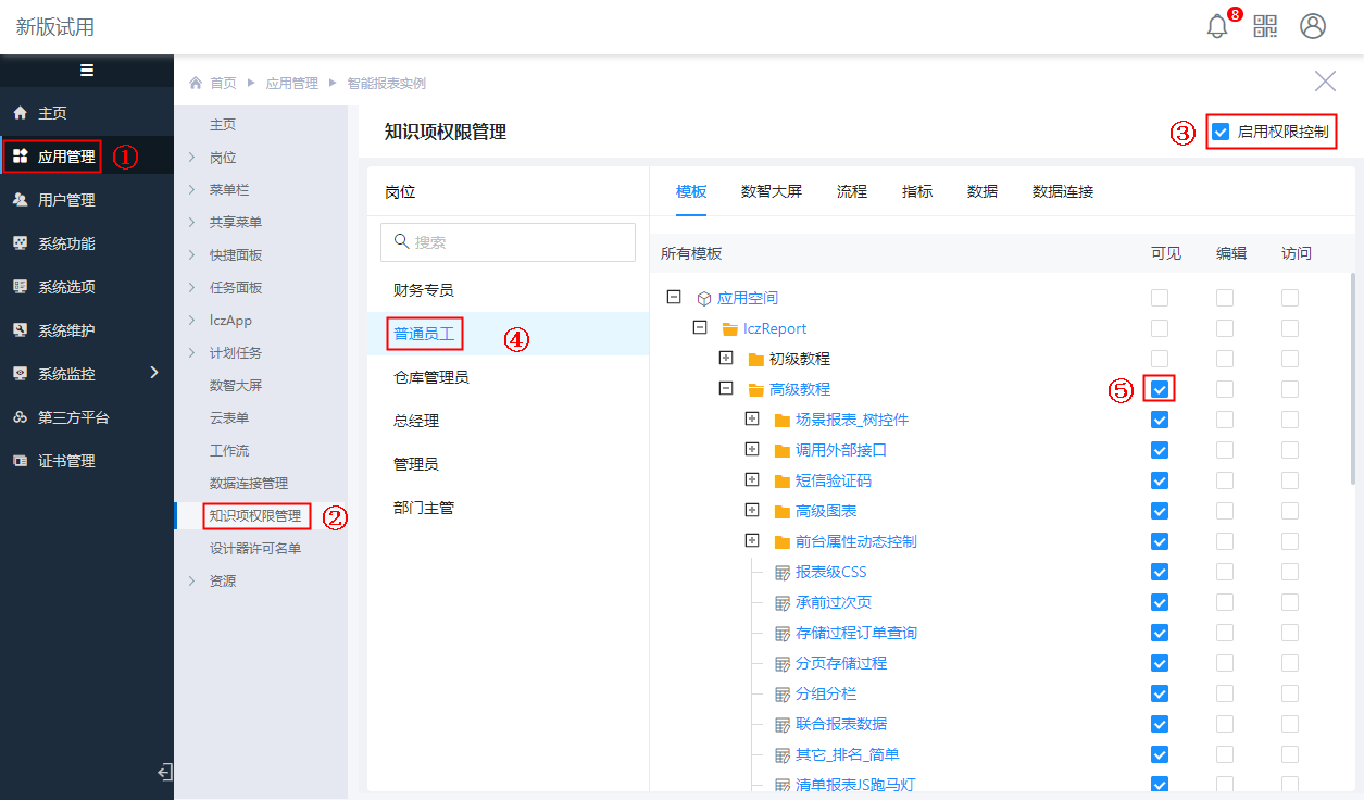 点击“知识项权限管理”菜单,勾选“启用权限控制”,选择“普通员工”岗位,为“模板”权限中的“高级教程”目录勾选[可见]权限,如下图: