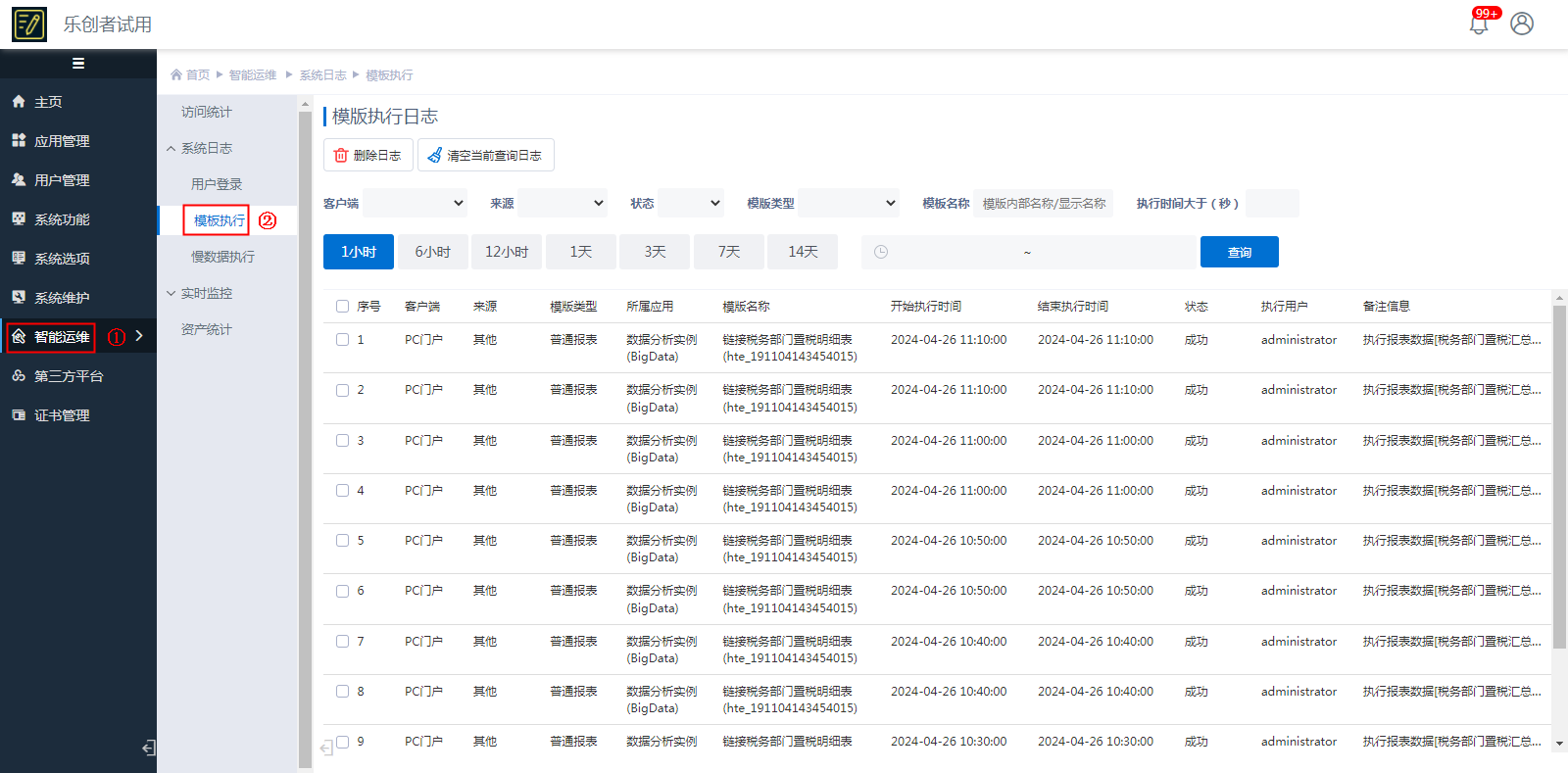 系统管理员登录系统后,执行[智能运维>系统日志>模板执行]菜单,如下图:
