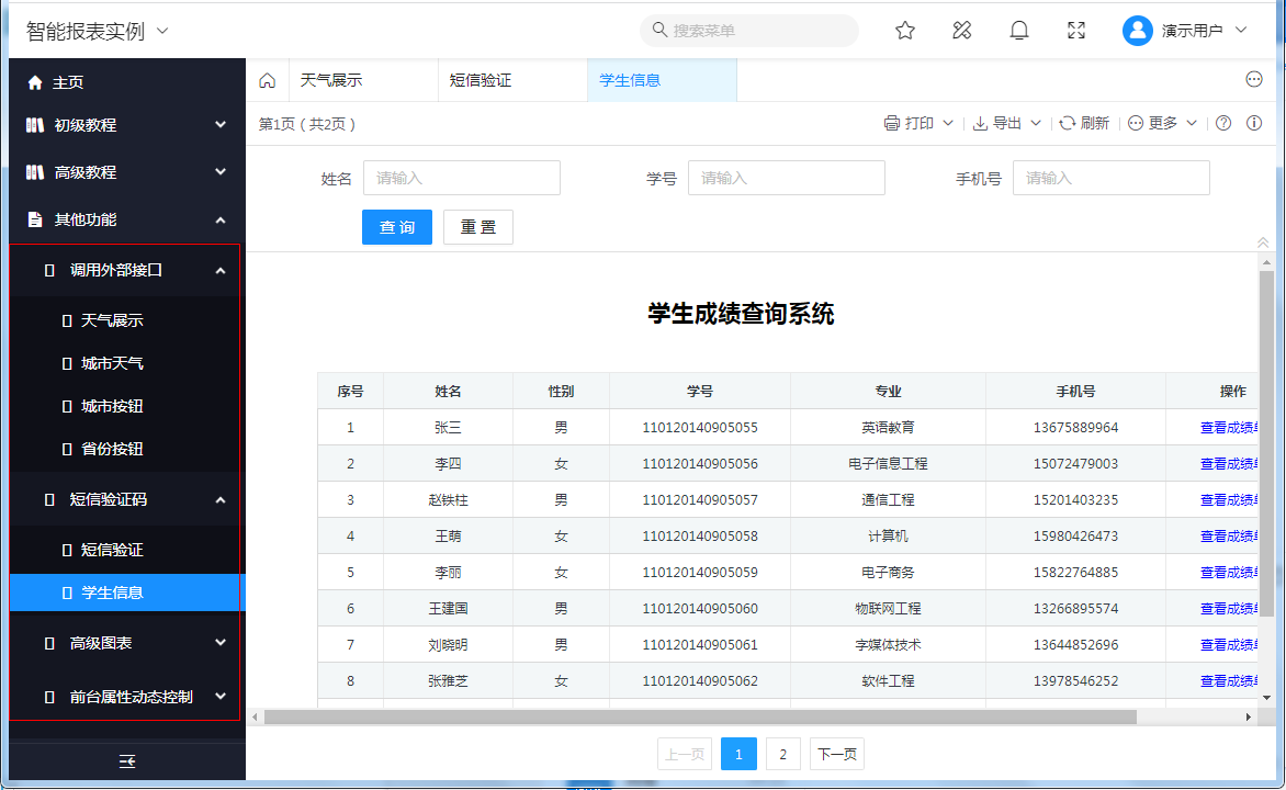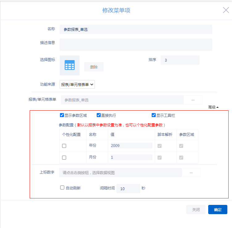 选择模板后将显示高级配置,不同模板支持的高级配置有所不同,下面以报表为例进行介绍,支持的高级功能如下: