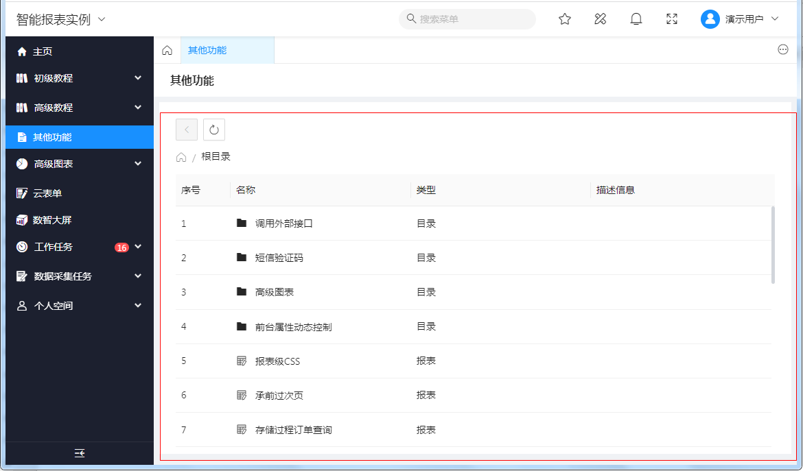 目录下的功能与其他菜单展示方式一致,有权限的所有目录以及菜单功能,将按照[系统选项>首选项]中的“菜单左侧栏展示方式”配置进行展示。比如“按完整树展示”,效果如下图: