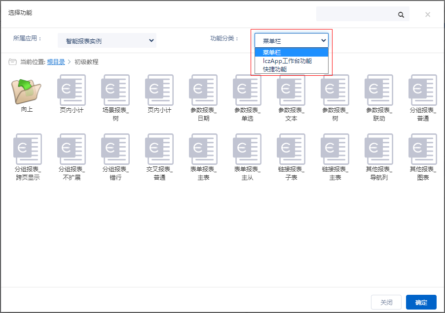 即链接至某应用下设计器模板对应的某个目录,可以批量将某目录下的模板配置为菜单功能,只能选择目录。如下图: